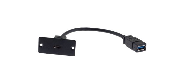 WU−CA es un inserto de placa de pared único con un conector USB tipo C en la parte frontal y un cable de 12 cm con un conector USB tipo A hembra en la parte trasera.